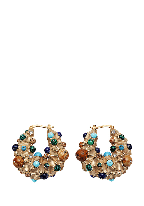 기하학적인 주머니 모양에 터키석, 말라카이트, 픽처 재스퍼, 라피스, 큐빅 지르코니아 등 다양한 스톤으로 장식한 이어링 가격 미정 보테가 베네타. 02-3438-7682