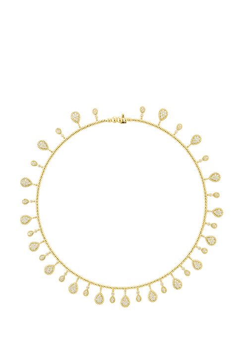 신비스럽고 관능적인 뱀의 모습에서 영감을 받은 컬렉션의 네크리스로 옐로 골드와 다이아몬드의 조합이 만들어낸 드롭 디자인이 목을 감싸며 눈부신 빛을 선사한다. 2백26개의 라운드 다이아몬드 2.8캐럿과 18K 옐로 골드로 이뤄져 있다. 3천만원대 부쉐론. 02-3277-0148