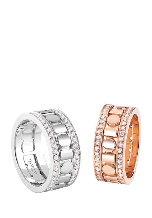 밴드 중앙에 동그라미와 사각형이 반복되며 회전하는 모티브를 표현한 모던하고 세련된 스타일의 벨 에포크 릴 화이트 골드 다이아 링과 핑크 골드 다이아 링 가격 미정 다미아니. 02-515-1924