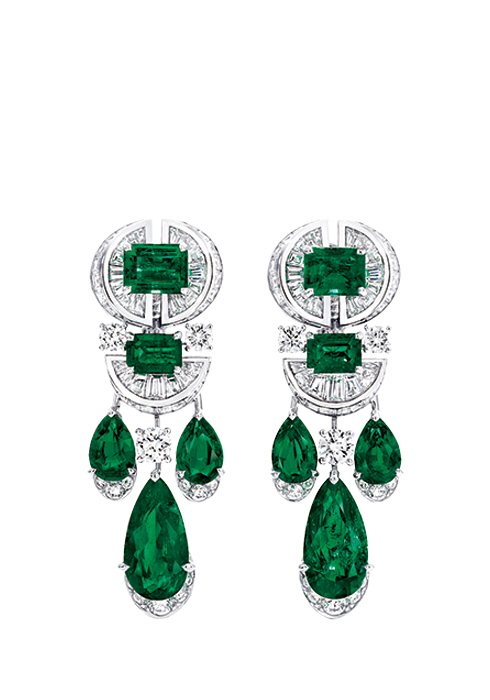 그라프 대표 하이 주얼리 컬렉션인 트라이벌 컬렉션 이어링으로 3.27캐럿과 2.66캐럿의 콜롬비아산 에메랄드를 세팅했으며, 그 주위를 총 5.7캐럿의 다이아몬드가 감싸고 있어 화려함을 극대화한다. 그 아래는 총 12.6캐럿의 에메랄드를 드롭 스타일로 마무리했다. 가격 미정 그라프. 02-6905-3330