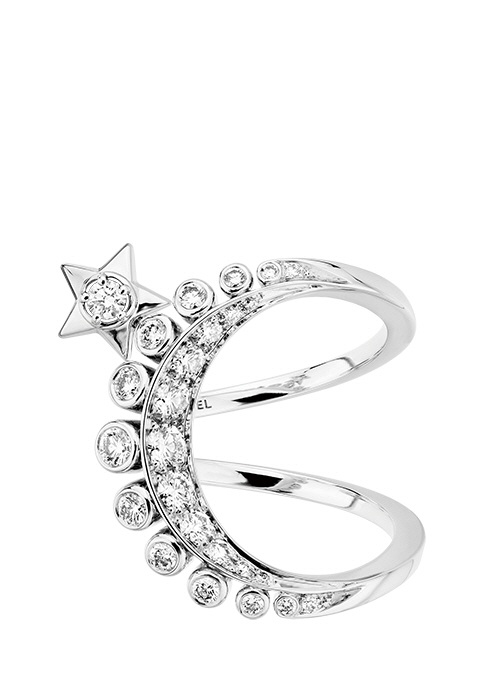 혜성에서 영감받아 탄생한 꼬메뜨 컬렉션의 링으로 18K 화이트 골드에 라운드 컷 다이아몬드 25개를 배치해 아름다운 밤하늘을 담았다. 2천1백20만원대 샤넬 화인 주얼리. 080-805-9628