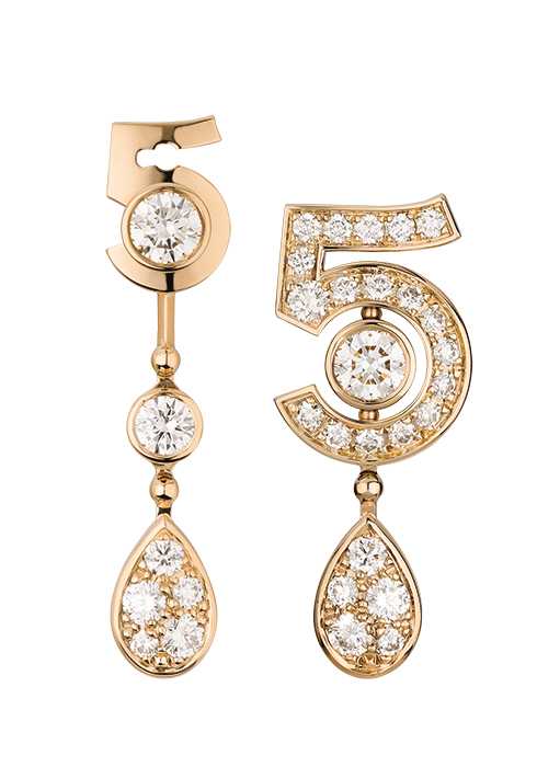상징적인 숫자인 5를 이루는 18K 베이지 골드 위에 31개의 브릴리언트 컷 다이아몬드 총 0.62캐럿을 세팅했으며, 다양한 스타일로 착용 가능한 이터널 N°5 이어링 1천6백90만원 샤넬 화인 주얼리. 080-805-9628