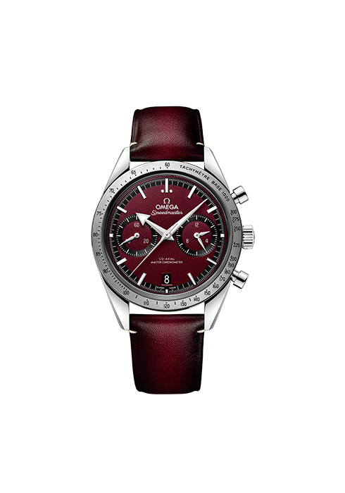 전설적인 1957년 오리지널 스피드마스터에서 영감을 받은 40.5mm 모델로, 스테인리스 스틸 케이스에 버건디 다이얼의 로듐 도금 아워 마커가 돋보이는 스피드마스터 ’57 코‑액시얼 마스터 크로노미터 크로노그래프 40.5MM 1천1백40만원 오메가. 02-6905-3301