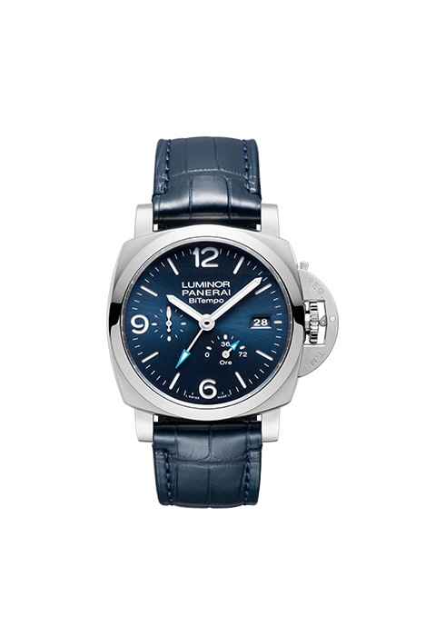 지름 44mm 케이스에 GMT 기능을 갖추었다. 선명한 셀룰리언 블루 핸즈를 통해 멀거나 가까운 2개의 다른 시간대를 한눈에 확인할 수 있는 루미노르 비템포 1천2백만원대 파네라이. 1670-1936