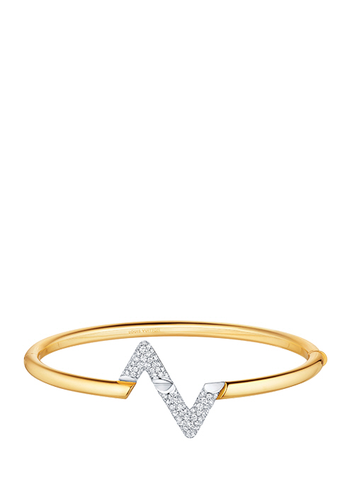 18K 옐로 골드 소재 밴드에 18K 화이트 골드와 다이아몬드 84개로 장식한 LV 모티브로 포인트를 준 LV 볼트 브레이슬릿 가격 미정 루이 비통. 02-3432-1854