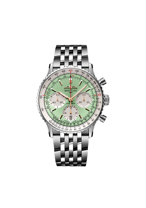 30mm 지름에 7.2mm 두께의 스틸 케이스, 민트 컬러 다이얼과 대비를 이루는 크로노그래프 카운터 슈퍼루미노바 야광 인덱스가 매력적이다. 또 70시간의 파워 리저브를 자랑한다. 내비타이머 B01 크로노그래프 41 1천2백70만원대 브라이틀링. 02-3448-1230