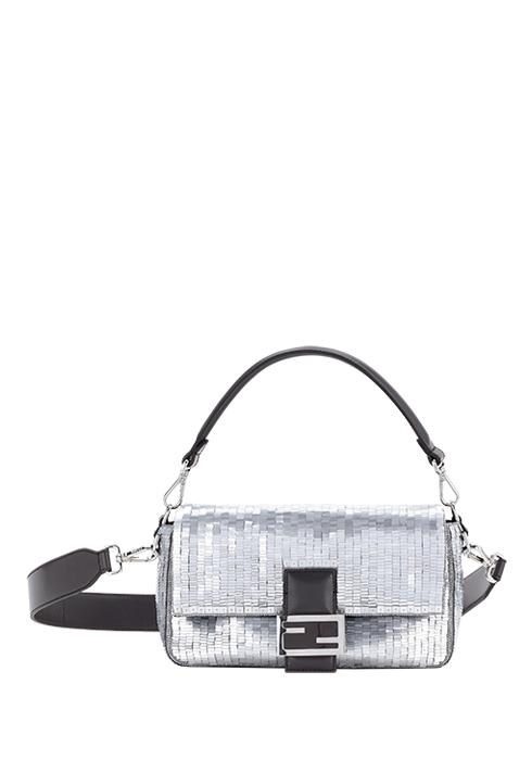 1천2백60개의 알루미늄 톤 스퀘어 시퀸을 사용해 섬세하게 수공 자수로 완성한 알루미늄 톤 시퀸 리-에디션 바게트 백 6백만원대 펜디. 02-3479-1271