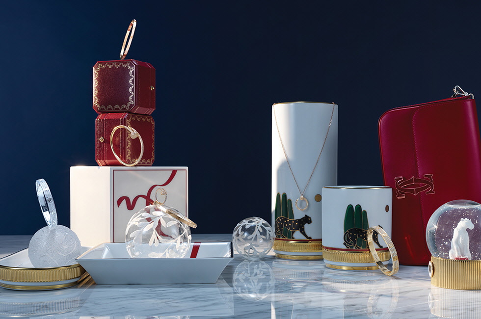 화이트와 골드로 모던하고 세련된 느낌을 자아내는 트레이로 바닥에 그려진 상징적 팬더 문양이 돋보이는 팬더 드 까르띠에 오벌 트링킷 트레이 73만5천원. 까르띠에가 재해석한 리본 모티브가 인상적인 화이트 컬러의 앙트라세 드 까르띠에 주얼리 박스 2백36만원. 순수한 화이트 컬러에 골드 라인과 중앙의 레드 리본 문양이 돋보이는 앙트라세 드 까르띠에 트링킷 트레이 59만원. 공간에 모던하면서 고급스러운 포인트를 줄 팬더 드 까르띠에 화병 미디엄 사이즈 모델로 까르띠에의 심벌인 팬더 문양과 그린·레드·화이트·골드 컬러 조화가 돋보인다. 1백44만원. 지루한 일상에 활기를 불어넣을 팬더 드 까르띠에 펜슬 홀더 85만원. 체리 레드 컬러 송아지가죽에 체인 스트랩으로 마무리한 두블르 쎄 드 까르띠에 체인 백 3백21만원. 까르띠에의 상징적 모티브인 팬더가 앉아 있는 스노볼인 디아볼로 드 까르띠에 스노우 글로브 가격 미정. 모두 까르띠에. 문의 1566-7277