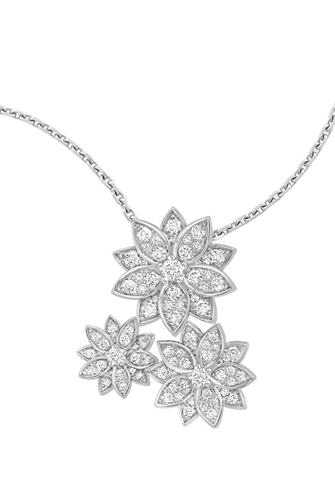 화이트 골드 소재의 다이아몬드 세팅 로터스 플라워 3개로 장식한 로터스 펜던트 2천2백만원대 반클리프 아펠 1668-1906