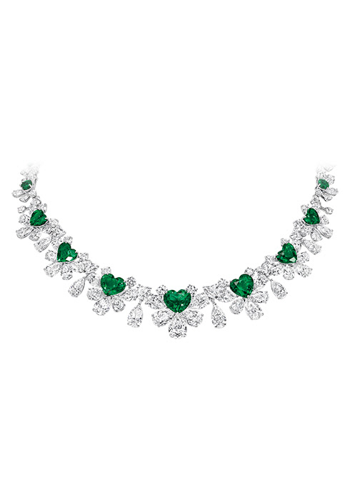 하트 셰이프의 총 26.45캐럿 에메랄드와 총 77.19캐럿 멀티 셰이프 다이아몬드로 화려하게 장식한 네크리스 가격 미정 그라프 02-6905-3330