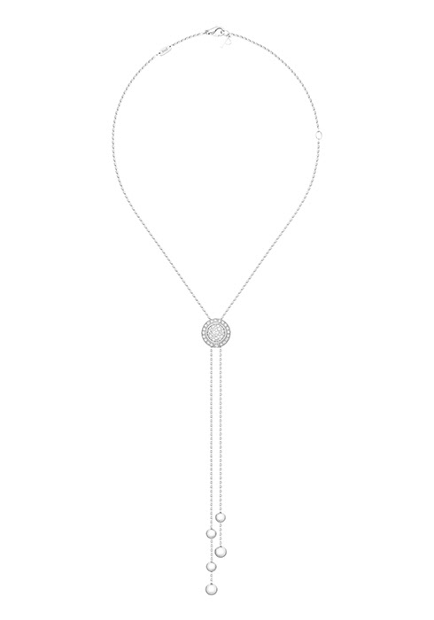 다이아몬드 세팅 회전 밴드가 가운데 파베 세팅한 카보숑 컷 다이아몬드를 감싸고 있는 형태로, 체인과 체인 양 끝에 달린 비즈까지 모두 화이트 골드로 이뤄진 포 제션 슬라이딩 펜던트 1천3백20만원 피아제 1668-1874