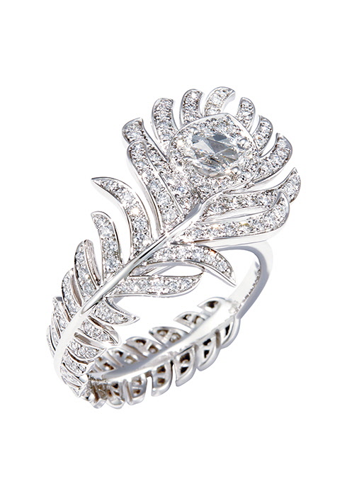 0.51캐럿 로즈 컷 다이아몬드를 중심으로 3백14개의 라운드 다이아몬드로 장식한 깃털 디자인의 화이트 플륌 드 펑 라지 링 5천만원대 부쉐론 031-5170-1177