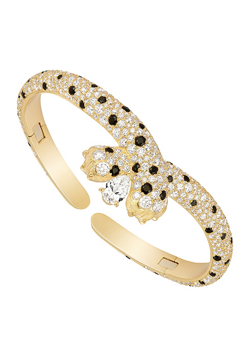 옐로 골드에 파베 세팅 다이아몬드와 블랙 스피넬로 장식한 뒤 페어 컷 다이아몬드 1개를 세팅한 옹브르 펠린느 브레이슬릿 가격 미정 프레드 02-514-3721