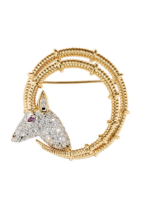 라운드 브릴리언트 다이아몬드로 장식한 포인트 오브제를 매치한 옐로 골드 슐럼버제 아이벡스 클립 브로치 가격 미정 티파니 02-6250-8620