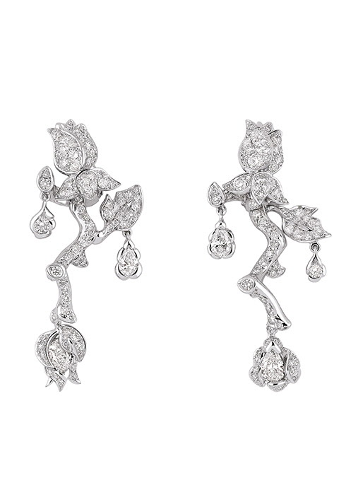 정교한 장미 모양의 화이트 골드에 총 3.48캐럿 다이아몬드를 세팅한 로즈 디올 바가텔 라지 이어링 가격 미정 디올 파인주얼리 02-3480-0104