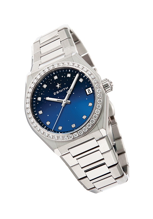 밤하늘을 연상시키는 블루 다이얼에 베젤 다이아몬드 세팅을 더한 데피 미드나잇 1천5백11만원 제니스 02-3277-0185
