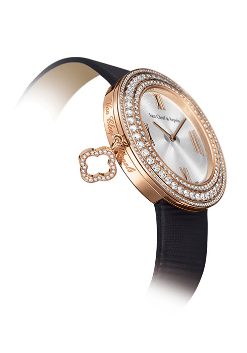 베젤에 다이아몬드 3줄을 더한 25X25mm 핑크 골드 케이스에 알함브라 참으로 장식한 참 워치 2천5백만원대 반클리프 아펠 1668-1906