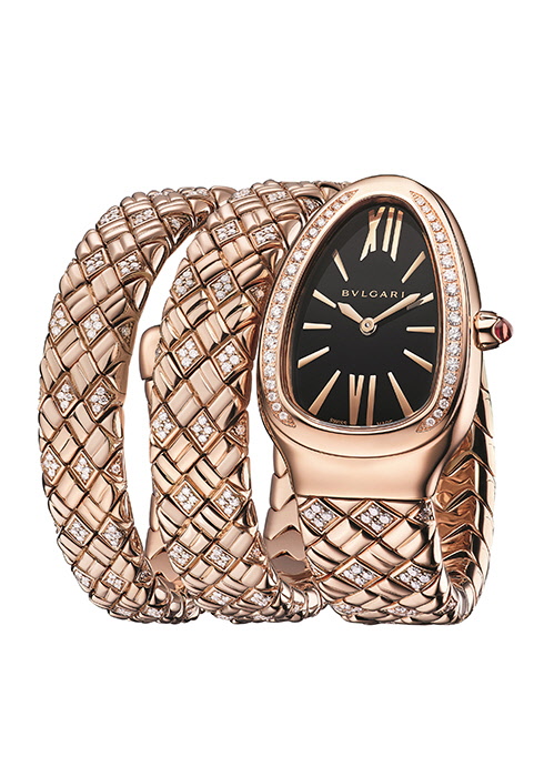 다이아몬드 세팅 케이스에 쿼츠 무브먼트로 작동하는 로즈 골드 소재 세르펜티 스피가 8천5백만원대 불가리 02-2056-0171