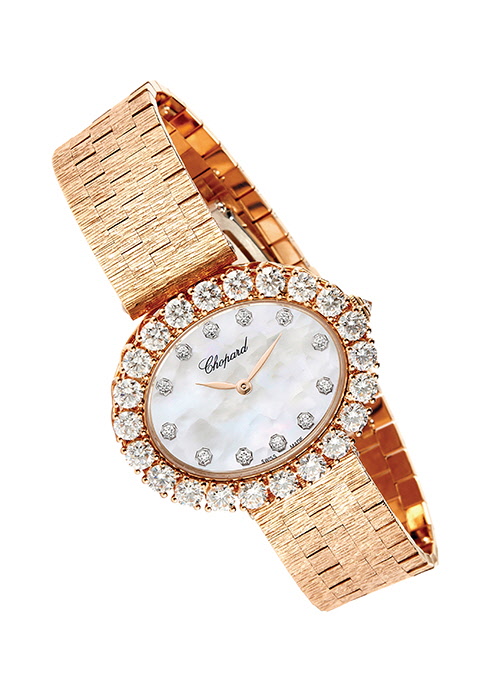 자개 다이얼에 다이아몬드 베젤과 아워 마커를 갖춘 디아망트 로즈 골드 브레이슬릿 9천9백23만원 쇼파드 02-6905-3390