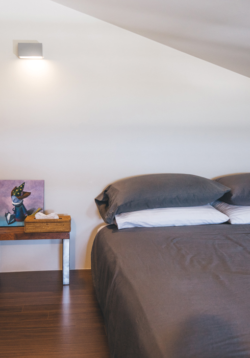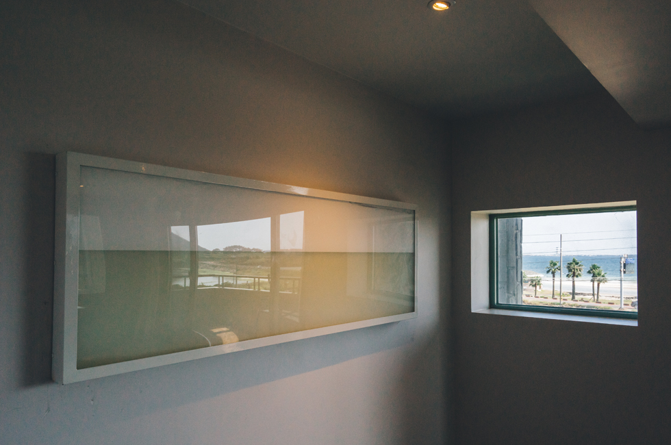 201호에서는 로와정 작가의 드로잉과 조명 작품을 만날 수 있다. 로와정은 노윤희, 정현석 작가로 구성된 미술가 듀오인데, 벽면의 드로잉 작품 ‘Uncertain #1’은 본인들의 모습을 투영한 듯해서 흥미롭다. 이 방의 조명 작품 ‘워너 비 해피 에브리 나이트(Wanna be Happy Every Night)’는 여성과 남성의 체크 패턴 브리프로 만들었는데, 밤에 침대에 누워 맞은편 바다를 바라보면 이 조명이 별처럼 유리문에 투영된다.