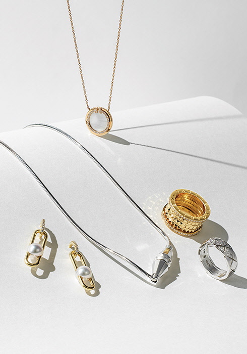T 모티브 다이아몬드로 감싼 화사한 머더오브펄 펜던트가 돋보이는 티파니 T 컬러 T 투 서클 펜던트 가격 미정 티파니. 1980년대 불가리 헤리티지 투보가스 초커에서 영감을 얻어 스터드를 더한 불가리 비제로원 락 밴드 링 9백만원대 불가리. 31개의 라운드 컷 다이아몬드를 세팅한 퀼팅 모티브의 화이트 골드 코코 크러쉬 스몰 링 가격 미정 샤넬 화인 주얼리. 오디오 케이블 잭을 닮은 ‘인피니’ 모티브와 라운드 체인을 결합해 브레이슬릿, 네크리스 등 다양한 방식으로 연출할 수 있는 화이트 골드 잭 트리플 랩 1천만원대 부쉐론. 크기가 다른 2개의 옐로 골드 링크와 아코야 진주의 배치가 감각적인 파인 링크 이어링 4백10만원대 타사키.