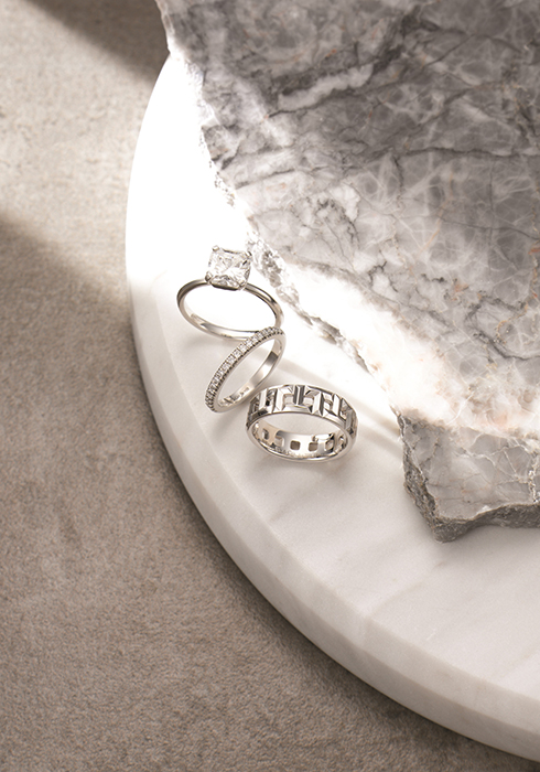 (위부터) 티파니 트루 링 다이아몬드의 영롱한 광채를 돋보이게 하는 동시에 손가락과 가깝도록 정교하게 설계한 플래티넘 링 가격 미정. 티파니 솔리스트 밴드 링 얇은 플래티넘에 다이아몬드를 세팅한 밴드 링 3백40만원. 티파니 T 트루 링 서로 맞물린 알파벳 T가 체인 형태로 교차돼 강인한 균형미를 보여주는 18K 화이트 골드 링 1백86만원. 문의 02-547-9488
