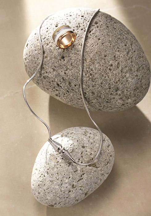 부쉐론 잭 트리플 랩 다이아몬드 화이트 골드 오디오 케이블 잭에서 영감을 얻은 그래픽적 모티브와 라운드 체인, 멀티웨어 옵션을 통해 자유자재로 변형하고 매치할 수 있는 화이트 골드 다이아몬드 네크리스 1천9백80만원. 부쉐론 콰트로 화이트 다이아몬드 라지 링 옐로ㆍ화이트ㆍ핑크 골드와 부쉐론의 특별한 공법으로 제작한 화이트 하이 세라믹을 결합한 링 1천1백90만원. 문의 02-6905-3322