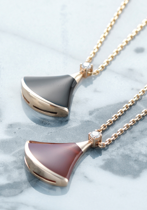 오닉스와 코넬리언으로 완성한 부채 모양의 펜던트 네크리스. 작지만 디자인과 색상이 눈을 사로잡는다. 각 2백만원대.