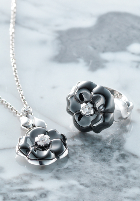 블랙 세라믹 소재로 세련된 동백꽃을 표현한 네크리스와 링. 라운드 컷 다이아몬드가 세팅되어 있다. 각 5백만원대.