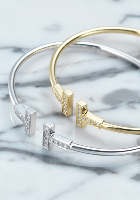 올해 티파니가 새롭게 선보인 모던한 디자인의 티파니 T 컬렉션 브레이슬릿. 옐로 골드와 화이트 골드에 다이아몬를 세팅한 버전 중 선택할 수 있다. 각 5백만원대.