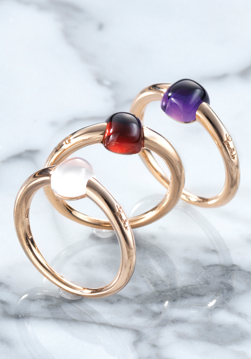 ‘사랑한다, 사랑하지 않는다’ 라는 의미의 이탈리아 컬러 스톤 주얼리. 왼쪽부터 화이트 문스톤, 가닛, 애미시스트를 세팅했다. 레이어링해서 착용하면 더욱 멋스럽다. 각 1백77만원.