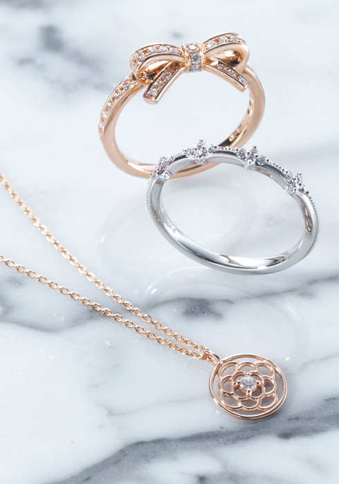 추운 겨울 눈꽃을 모티브로 한 이베 핑크 골드 네크리스 40만원대, 플래티넘에 작은 핑크 다이아몬드를 세팅한 코라이유 링 1백90만원대, 리본 모티브의 누브리앙 링 1백50만원대.