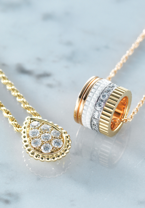 뱀에서 영감을 얻은 디자인에 다이아몬드를 세팅한 쎄뻥 네크리스 7백만원대. 옐로와 화이트 골드, 화이트 세라믹을 매치하고 다이아몬드를 파베 세팅한 콰트로 네크리스 9백만원대.