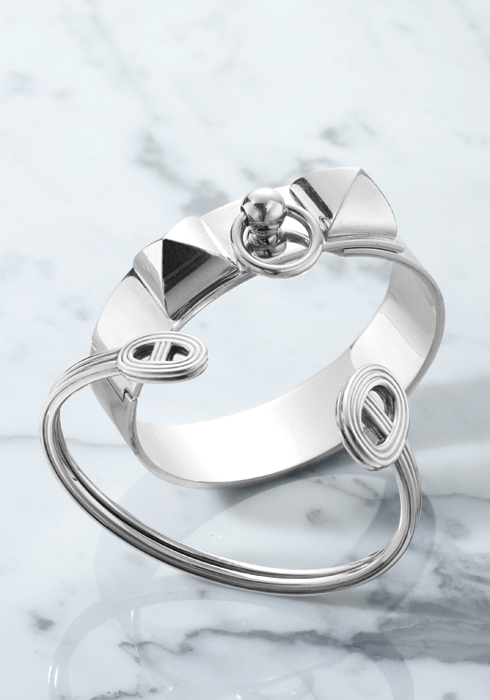 순도 높은 실버로 완성한 주얼리 컬렉션. 스터드 모티브 브레이슬릿 3백만원대, 원형 모티브 브레이슬릿 1백만원대.
