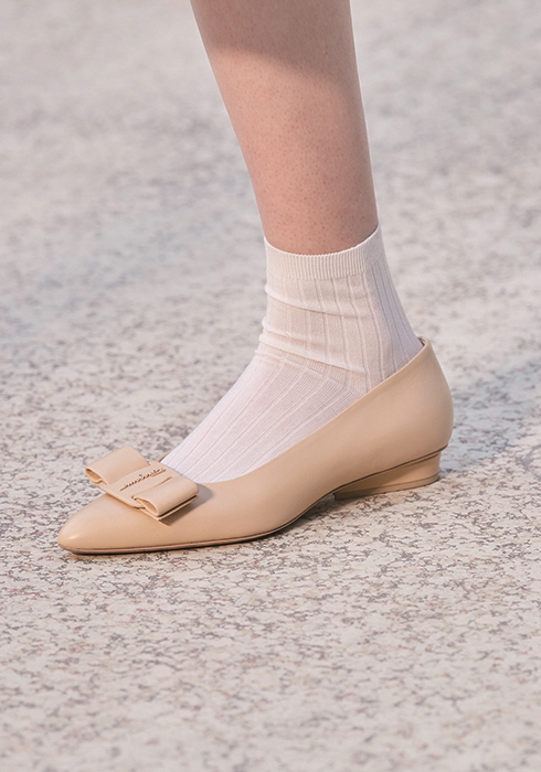 경쾌하고, 밝고, 즐거운 삶을 표현한 이번 살바토레 페라가모 2020 S/S 컬렉션은 크리에이티브 디렉터인 폴 앤드류의 행복한 유년 시절에서 비롯되었다. 청량한 컬러가 산뜻하게 조화를 이루고, 크리스피한 코튼, 밀도 있는 니트, 라이트한 하이 퀄리티의 가죽 등이 스파이시한 색상, 과감한 프린트와 어우러져 경쾌하고도 편안한 느낌을 주는 룩으로 가득했다. 가장 먼저 눈에 띈 것은 사랑스럽게 변신한 바라 슈즈. 1979년 창립자 살바토레 페라가모의 딸, 피암마 살바토레 페라가모(Fiamma Ferragamo)가 디자인한 하우스의 아이콘 바라(Vara) 슈즈는 비바(Viva)로 재탄생했다. 세련된 스펙트럼의 단색은 더욱 시크한 느낌이고, 상징적인 디테일인 리본, 보(bow)와 토 부분은 더욱 날렵해져 동글동글 귀엽고 러블리한 슈즈에서 에지 있고 세련된 분위기로 변신했다. 이번 S/S 시즌 가장 주목받는 슈즈 중 하나로 떠오를 듯한 기분 좋은 예감.
