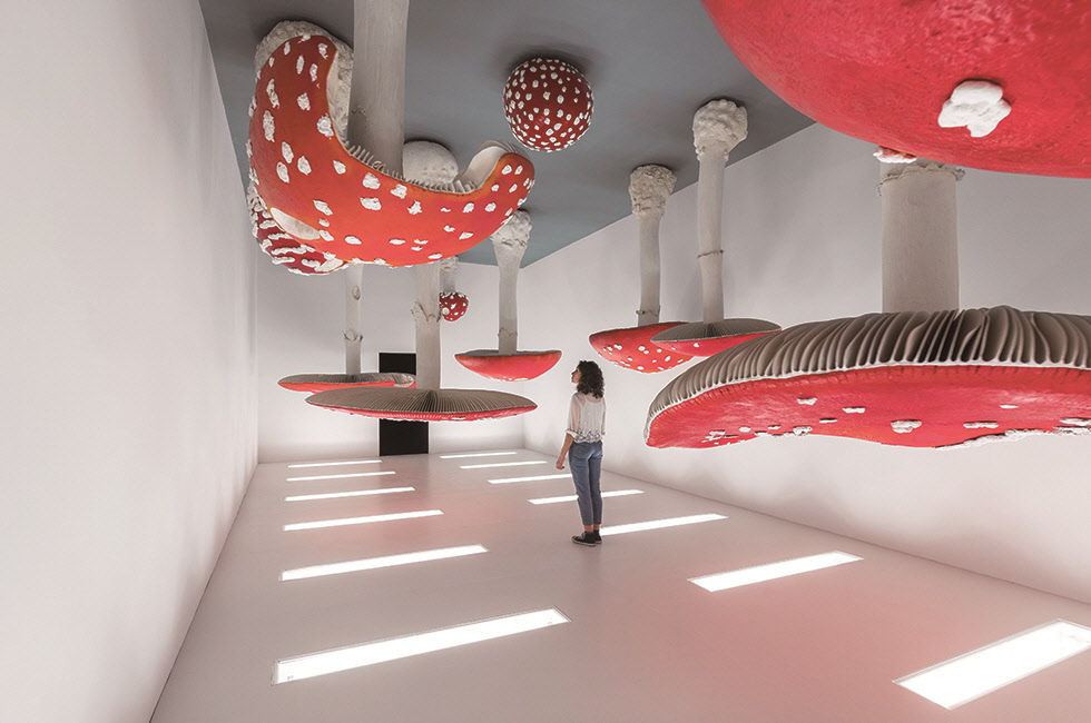 운 좋게도 맑고 청정한 하늘이 펼쳐진 날에 프라다 파운데이션 밀라노 건물의 자태를 처음 접했다면 살짜기나마 숨을 ‘헉’ 들이마시게 될지도 모르겠다. 햇빛에 반사되어 빛나는 금색과 회색 건물들, 그리고 가장 높이 솟은 하얀색 타워 등 형태와 높이가 저마다 다른 건축물이 자아내는 묘한 조화. 게다가 옛것과 새것의 융합으로 뭔가 특별한 오라(aura)가 밴 이 넓은 전시 공간을 접하고는 반하지 않기는 힘들다. ‘도시 재생’으로 유명한 네덜란드 건축 거장 렘 콜하스(Rem Koolhaas)가 이끄는 OMA가 설계를 맡았는데, 새롭고 매혹적인 랜드마크가 주는 힘을 여실히 증명해냈다. 허름한 산업 단지 라르고 이사르코(Largo Isarco)에 있는, 1910년대 지은 옛 증류주 공장이 경이롭게 탈바꿈한 사례다. 외관을 유지한 채 어린이 도서실, 영화감독 웨스 앤더슨이 특유의 동화적인 솜씨를 발휘해 디자인한 카페 등으로 개조한 기존 건물들에 새 건물을 추가한, 1만9,000㎡에 달하는 방대한 복합 공간이다. 1년에 2~4차례 열리는 대규모 기획전을 품을 수 있는 다용도 공간 포디엄이 입구에서부터 펼쳐지며, 마당 한가운데는 영화나 음악 콘텐츠를 즐길 수 있는 극장도 있다. 2018년 완공된 60m 높이의 흰색 노출 콘크리트 건물인 ‘타워(Torre)’에서는 9층에 걸쳐 소장품을 전시하는데, 바로 제프 쿤스(Jeff Koons)의 커다란 ‘튤립(Tulip)’이라든지 카르슈텐 횔러(Carsten Ho··ller)의 ‘업사이드 다운 머시룸 룸(Upside Down Mushroom Room)’ 같은 ‘킬러 콘텐츠’를 만날 수 있는 곳이다. 가장 안쪽에 자리하며 황금빛 외관을 뽐내는 ‘유령의 집(Haunted House)’에는 섬뜩하고 초현실적인 느낌을 주는 로버트 고버(Robert Gober)와 루이스 부르주아(Louis Bourgeois) 작품이 영구 전시되고 있다. 건축물이든 현대미술의 다면적인 매력이 폭넓고 깊게 펼쳐져 있는 이 도발적이기까지 한 ‘매혹의 전당’의 등장을 계기로 썰렁했던 이 근방에 활기가 감돌기 시작한 건 어쩌면 당연한 결과가 아닐까.