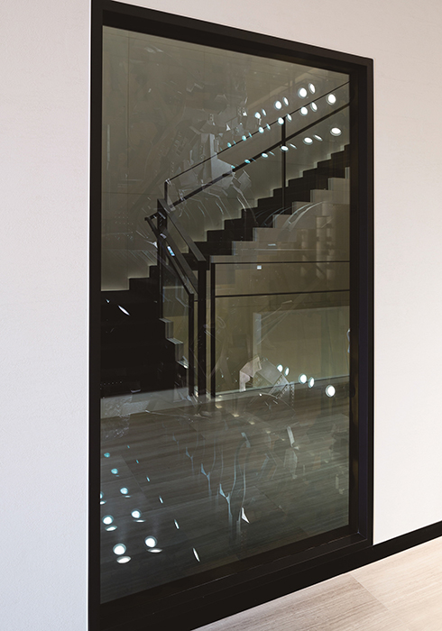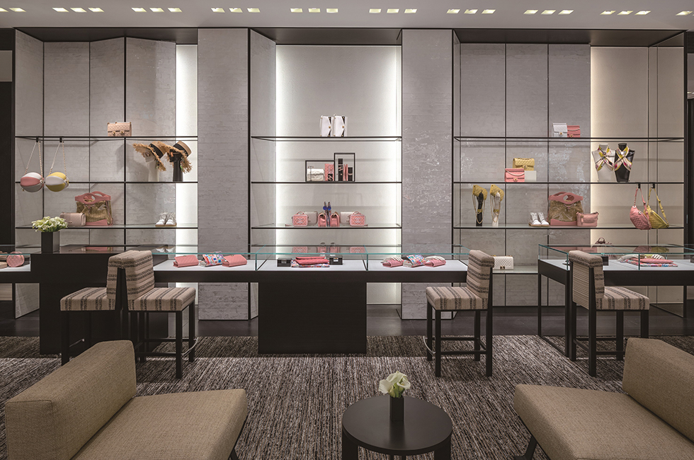 개방형 레이아웃인 부티크는 고객의 시선이 한 공간에서 다른 공간으로 자연스럽게 흘러가도록 이끈다. 그 속에 제품을 스며들 듯 말끔하게 전시하여 편안한 쇼핑이 이루어지도록 배려했다. 1층은 시즈널 핸드백, 스몰 레더 제품과 워치, 하이 주얼리(high jewelry), 화인 주얼리(fine jewelry)를 선보이는데, 가브리엘 샤넬의 아파트를 떠올리게 하는 코로만델 병풍이 쳐진 특별한 룸이 바로 옆에 있어 마음에 드는 하이 주얼리를 독립된 공간에서 편안하게 착용해 볼 수 있다. 빛나는 흰색의 석조 계단을 따라 2층으로 올라가면 슈즈 전용 살롱과 보다 다양한 액세서리와 핸드백을 진열한 공간이 나타난다. 2층은 넓고 높아 웅장함이 느껴진다. 3층까지 연결된 압축 성형한 레코드 벽인 독일 작가 그레고르 힐데브란트(Gregor Hildebrandt)의 작품 ‘사운드 배리어’가 그러한 분위기를 고조시킨다. 그가 그린 가브리엘 샤넬의 초상화가 이 공간을 내려다 보며 예술적인 온도를 높인다. 또한 목재, 거울, LED, 폴리우레탄, 아크릴 물감을 사용한 한국의 아티스트 이불의 2008년 작품 ‘무제’가 계단을 따라 이어지며 3층으로 안내한다. 3층은 레디투웨어전용 공간. 의상과 어울리는 핸드백과 슈즈를 매치해 토털 룩을 제시한다. 편안하게 휴식을 취하며 쇼핑을 할 수 있도록 독립적인 여러 개의 공간으로 구성한 점이 특징이다. 프랑스 인테리어 디자이너 쟝 미셸 프랭크(Jean-Michel Frank)의 데이배드, 크리스토퍼 콤 (Christopher Co^me)의 유명작 ‘아니스 라이트’ 등 커스텀 쇼파와 엄선한 앤틱 가구로 꾸며져 마치 고급스러운 파리 아파트의 응접실에 와 있는 듯한 기분을 들게 한다. 또한 바닥에 깔린 뉴트럴한 톤의 천연 소재 카펫이 공간에 따뜻함을 불어넣는다. 3층 곳곳에도 예술 작품이 전시되어있다. 앙드레 & 미셸 헐레 (Andre´e & Michel Hirlet)의 유약 바른 석조 조각, 나무에 혼합 매체를 사용한 강익중의 ‘작은 산들, 2013 (Small Mountains, 2013)’, 알루미늄에 오일 젯소로 그린 이드리스 칸(Idris Khan)의 ‘파크, 2014 (Park, 2014)’ 등, 이 작품들 역시 다양한 소재와 질감을 강조한 것으로 공간을 더욱 풍성하게 만든다. 3층에는 프라이빗한 넓은 피팅 룸도 있어 마치 집에서 옷을 입어보는 것 같은 편안함을 누릴 수 있다. 그 누구의 방해도 받지 않고 캐나다 추상 미술가 아그네스 마틴(Agne` s Martin)의 석판 작품과 레미 마르코비치(Re´my Markowitsch)가 캉송지(canson paper)에 잉크로 그린 흑백 추상화를 감상하면서 옷을 입어 볼 수 있다는 것, 멋지지 않은가! 4층의 프라이빗 리셉션 룸에도 선별된 큐레이터 컬렉션이 계속된다. 피터 마리노(Peter Marino)의 브론즈 박스 조각, 앤드류 로드(Andrew Lord)의 브론즈 조각, 네드 베나(Ned Vena)의 선형 회화를 이곳에서 만날 수 있다.