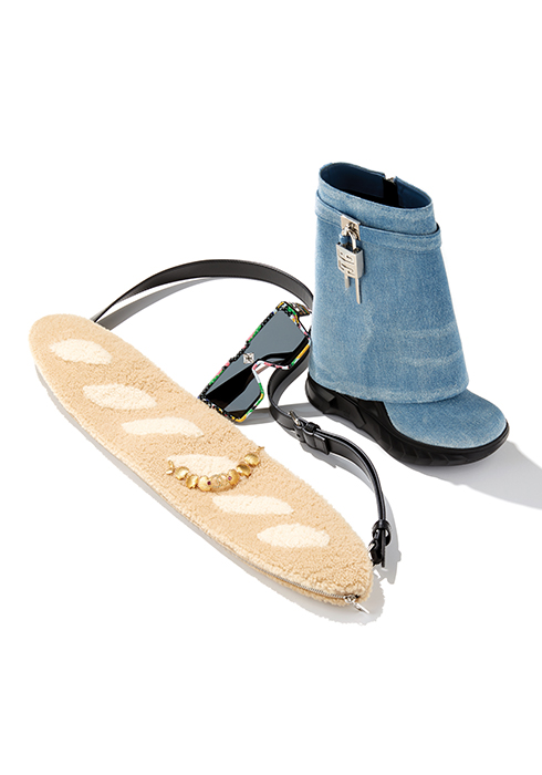클래식한 바게트 빵에서 영감을 얻은 베이지 컬러의 바게트 파우치 백 1백만원대 펜디. 문의 02-544-1925. 미니 조개 모티브와 유리 진주로 장식한 샤넬 로고가 특징인 메탈 소재의 브레이슬릿 가격 미정 샤넬. 문의 080-805-9628, chanel.com. 화려한 모노그램 패턴 테두리와 상단 중앙 및 템플의 크리스털 로고가 포인트인 아세테이트 소재의 밀리어네어 스퀘어 선글라스 가격 미정 루이 비통. 문의 02-3432-1854. 4G 로고가 각인된 실버 메탈 자물쇠 장식을 매치한 데님 샤크 락 바이커 앵클부츠 가격 미정 지방시. 문의 02-546-2790