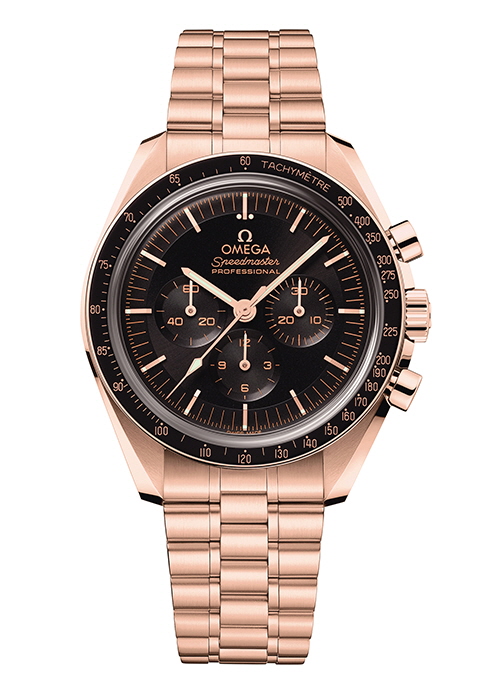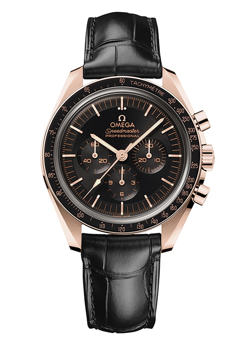 1 세드나 골드™ 소재에 레더 스트랩을 매치한 문워치 프로페셔널 코-액시얼 마스터 크로노미터 크로노그래프 42MM. 2 18K 세드나 골드™ 소재의 스피드마스터 문워치 프로페셔널 코-액시얼 마스터 크로노그래프 42MM. 3,4 카노푸스TM 골드 소재의 스피드마스터 문워치 프로페셔널 코-액시얼 마스터 크로노그래프 42MM
