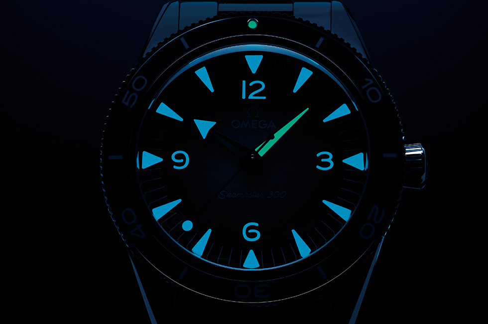3 로듐 도금 핸즈와 오목한 아워 마커, 인덱스 숫자를 라이트 블루 슈퍼루미노바로 마감했다.