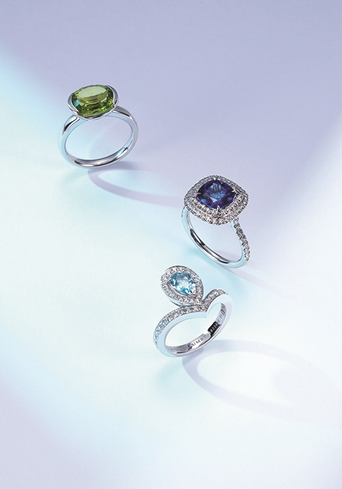 타사키 루미노 페리도트 링 측면을 드러낸 간결한 화이트 골드 밴드에 오묘한 녹색 페리도트를 세팅해 보석 자체의 아름다움을 감상할 수 있도록 했다. 가격 미정. 문의 02-3461-5558