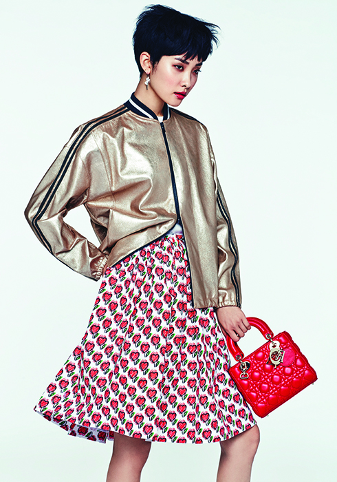 은은하게 빛나는 골드 컬러 블루종 재킷 8백59만원 브루넬로 쿠치넬리. 하트 플라워 패턴이 사랑스러운 풀 스커트 가격 미정 프라다. 레드 컬러 레이디 디올 백 4백만원대 디올. 스와로브스키를 세팅한 후프 이어링 18만원 타니 by 미네타니.