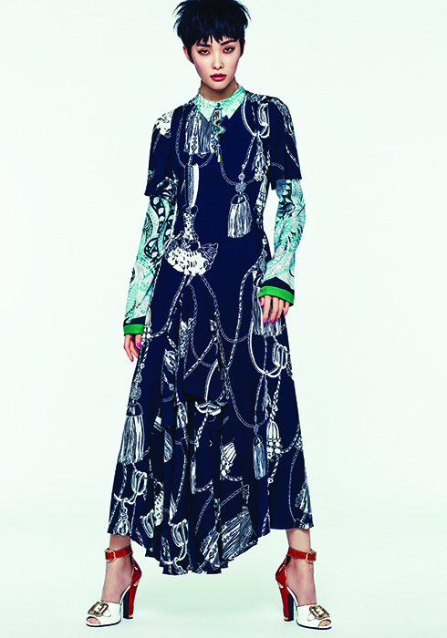 식물과 페이즐리 패턴으로 완성한 프린트가 고급스러운 블라우스, 체인 모티브 패턴의 언밸런스 컷 롱 드레스 모두 가격 미정 에르메스. 큼직한 멀티컬러 스와로브스키 네크리스 89만원 스와로브스키. 버클 디테일을 가미한 샌들 힐 1백만원대 프라다.