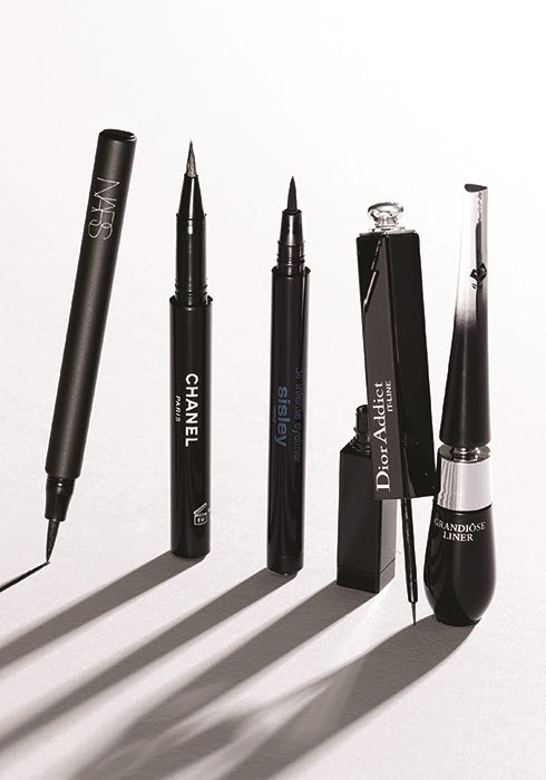 ‘나스 언리스트릭티드 새틴 아이라이너 스틸로 블랙 팬서’는 얇거나 두꺼운 라인을 자유자재로 그릴 수 있는 탄력 있고 섬세한 브러시가 돋보이는 제품으로, 새틴처럼 부드럽게 반짝이는 블랙 라인을 선사한다. 손으로 문질러도 번지지 않는 강력한 지속력 또한 일품(1.4ml 3만7천원). ‘샤넬 시그니처 드 샤넬 10 느와르’는 완벽한 딥 블랙 컬러로 세련되고 시크한 아이라인을 연출해준다. 촉촉하고 부드러운 텍스처로 쉽게 발리지만, 워터프루프, 스머지 프루프 기능을 겸비해 번지거나 지워지지 않는다(0.5ml 4만6천원). ‘시슬리 소 인텐스 아이라이너’는 리퀴드 타입의 펠트 팁으로 손쉽게 완벽하고 정교한 라인을 그릴 수 있으며, 원하는 무드나 상황에 맞게 라인의 굵기를 조절할 수 있다. 카본 블랙을 풍부하게 함유해 강렬한 컬러감과 함께 매트한 마무리로 뛰어난 고정력을 자랑한다(1ml 6만5천원). ‘디올 어딕트 잇-라인’은 강렬하고 또렷한 발색력이 돋보이는 젤 포뮬러를 함유해 라인을 그리자마자 피부에 밀착되며 하루 종일 번짐 없이 깔끔한 눈매를 연출한다. 얇고 정교한 브러시로 눈썹 사이사이 빈 공간 없이 꼼꼼히 메울 수 있고 얇은 라인부터 두꺼운 라인까지 매우 정확하고 정교하게 그릴 수 있다. 땀이나 물에 번지지 않지만 미온수나 리무버에는 쉽게 지워지니 클렌징도 간편하다(2.5ml 4만5천원). ‘랑콤 그랑디오즈 라이너’는 35도 휘어진 스틱으로 어떤 각도에서나 전문가 못지않게 또렷하고 섬세한 아이라인을 쉽고 다양하게 그릴 수 있는 것이 특징. 브러시를 보틀에 담그면 필요한 만큼만 액이 묻어나 뭉침 없이 깔끔한 아이라인을 연출할 수 있다(1.4ml 4만2천원대).