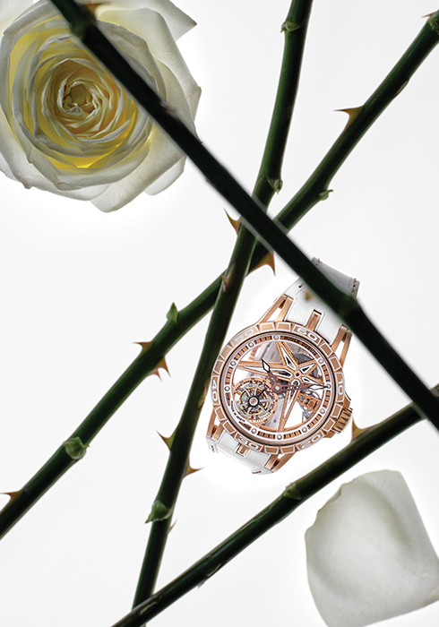티타늄 컨테이너와 러버 인레이 장식을 가미한 이온 골드 케이스에 전사 처리한 텍스트와 미닛 트랙을 적용한 핑크 골드 도금 하부 플랜지, 로듐 도금한 나사 모양 아워 마커를 장착한 화이트 세라믹 상부 플랜지로 완성한 엑스칼리버 스파이더 모노투르비용 2억8천5백99만5백원 로저드뷔. 문의 02-3479-1403