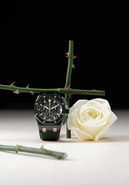 지름 43mm 블랙 세라믹 케이스와 그린 세라믹 소재의 베젤, 크라운, 푸시 버튼, 그리고 송아지가죽 스트랩이 조화를 이루며 그린 메가 태피스리 다이얼이 유니크한 매력을 자아내는 로열 오크 오프쇼어 셀프와인딩 크로노그래프 9천4백7만원 오데마 피게. 문의 02-543-2999
