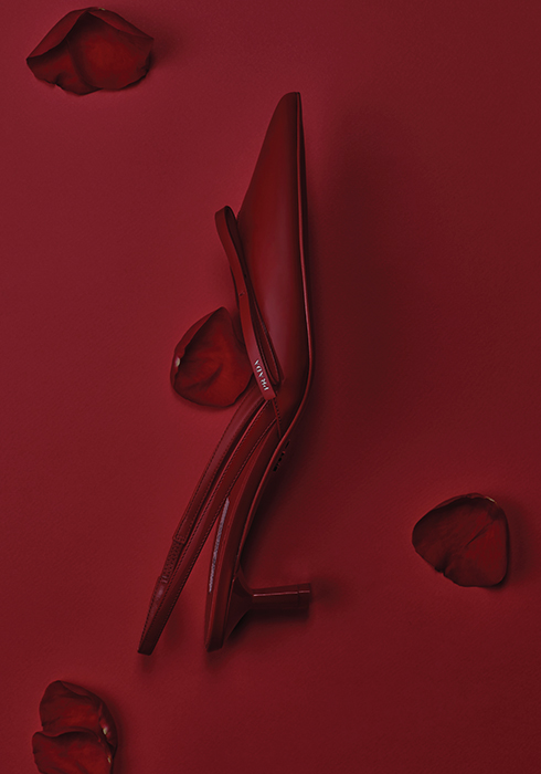 날카로운 실루엣, 기하학적인 키튼 힐 등 상징적인 프라다 트라이앵글에서 영감받은 여성스러운 테이퍼드 라인이 돋보이는 페이턴트 가죽 소재의 슬링백 펌프스 가격 미정 프라다. 문의 02-3442-1831