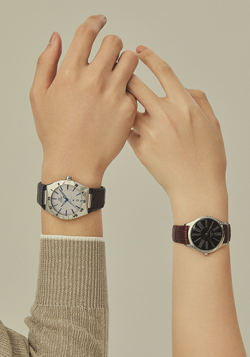 남성을 위한 컨스텔레이션 오메가 코-액시얼 마스터 크로노미터 39MM. 옐로 골드 케이스와 올리브 컬러 레더 스트랩의 감각적인 조화가 돋보이는 모델로 탁월한 항자성을 자랑하는 자체 제작 칼리버 오메가 8801을 장착했다. 2천만원대. 여성을 위한 컨스텔레이션 쿼츠 25MM. 고유의 ‘클러’ 장식 베젤과 머더오브펄 다이얼에 다이아몬드를 세팅해 우아함을 강조했다. 2천만원대. 모두 오메가.