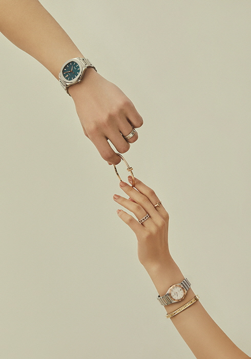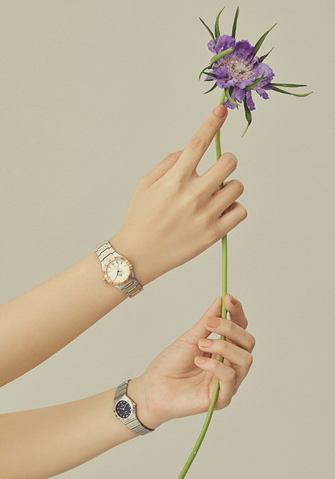 여성 손목에 착용한 드 빌 트레저 쿼츠 36MM은 그러데이션 래커 다이얼과 유려한 곡선형 케이스의 조화가 매력적인 모델. 스틸 케이스 측면에는 다이아몬드를 파베 세팅해 손목을 더욱 아름답게 장식한다. 5백만원대. 모두 오메가.