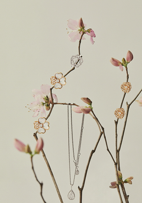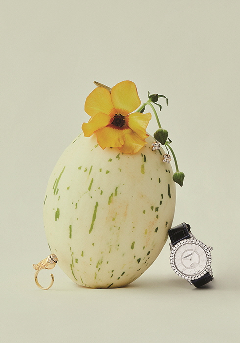 다이아몬드와 블랙 사파이어로 옐로 골드 링에 살포시 앉아 있는 사랑스러운 박새의 모습을 구현한 메이사(박새) 링 2천만원대 부쉐론. 별에서 영감을 얻은 티파니 빅토리아 컬렉션 이어링. 로즈 골드 보디에 마키즈 컷 다이아몬드를 세팅해 마치 작고 수수한 꽃잎 같다. 가격 미정 티파니.